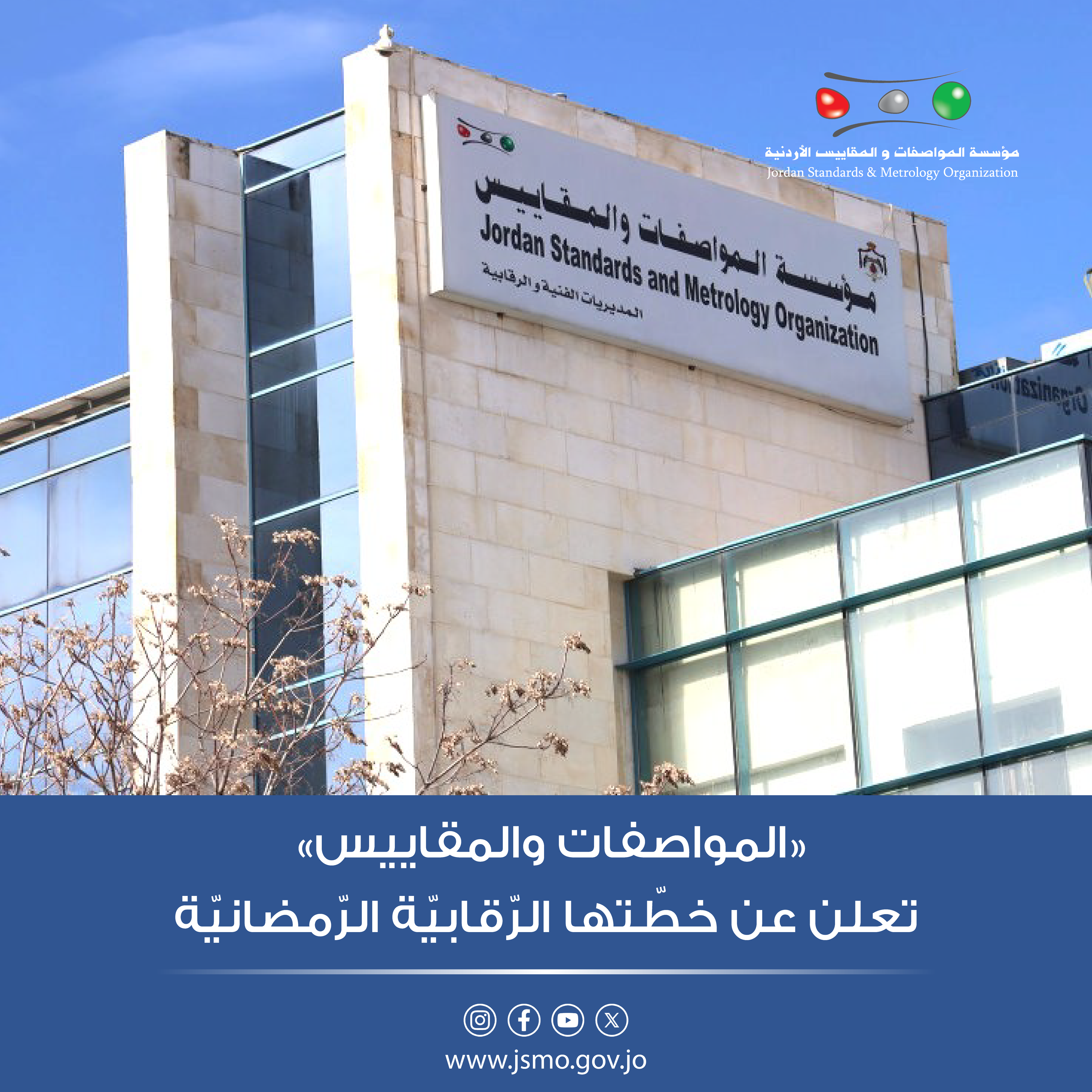 أعلنت مؤسسة المواصفات والمقاييس الأردنية بدء تنفيذ خطتها الرقابية لاستقبال شهر رمضان المبارك وعيد الفطر السعيد، وذلك ضمن مهامها وجهودها المستمرة في ضمان سلامة وجودة المنتجات المطروحة في الأسواق وحماية حقوق المستهلكين.